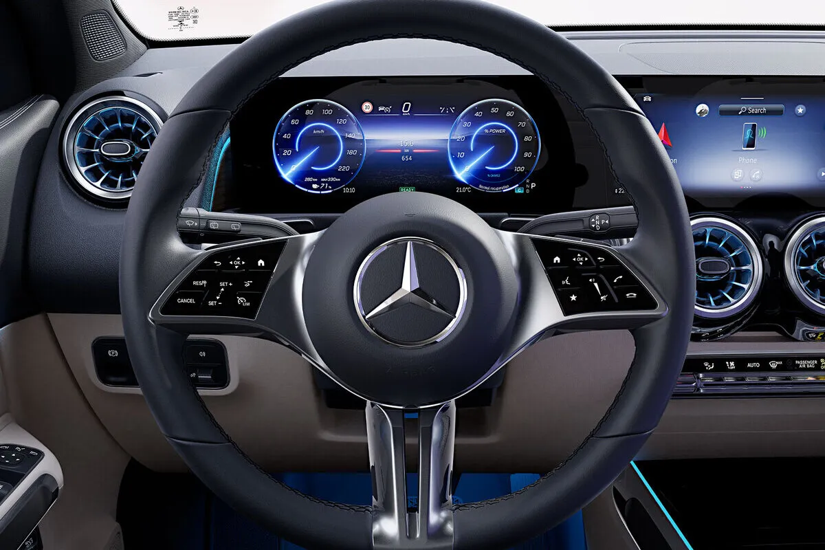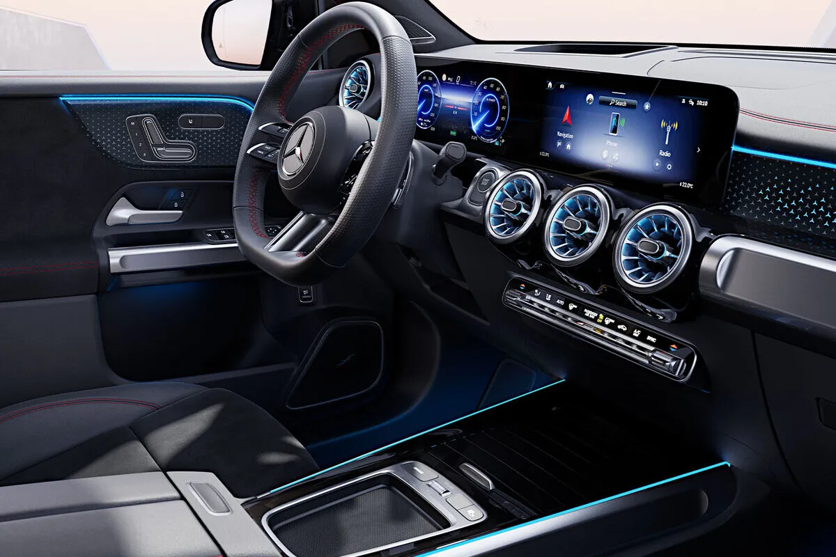 Інтер’єр EQB створено з акцентом на комфорт: цифрова панель приладів, мультимедійна система MBUX та підсвітка салону з 64 кольорами формують атмосферу преміум класу.
